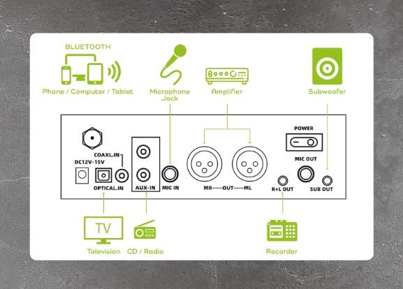 Karaokepaketin mikseri sisältää Toslink-optisen liitännän, joka yhdistää helposti modernin älytelevision. Näin saat YouTube-karokea, Singaa ja muita suoratoistopalveluita kuuluvaksi viiveettä ja kirkkaasti kaiuttimista.