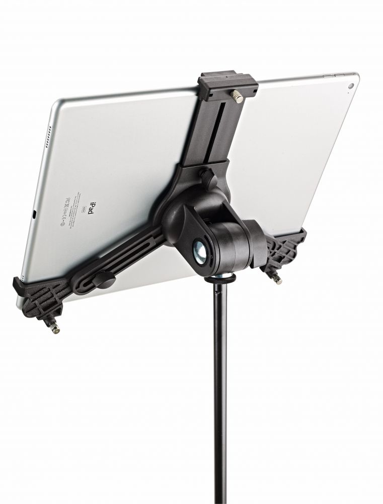 Universal Tablet Holder on monipuolinen ja säädettävä tablettiteline, joka mukautuu eri kokoisiin tabletteihin täysin ilman työkaluja. Se pitää laitteen tukevasti paikoillaan niin lavalla, treenikäytössä, kotona kuin studiossa. 3/8" naaraskierteen ansiosta pidike voidaan kiinnittää nopeasti esimerkiksi mihin tahansa mikrofonitelineeseen.