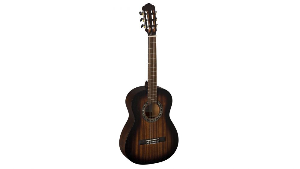 Tämä 3/4-kokoinen klassinen kitara yhdistää ergonomian ja lämpimän soinnin paketissa, joka on yhtä tyylikäs kuin se on kestäväkin.