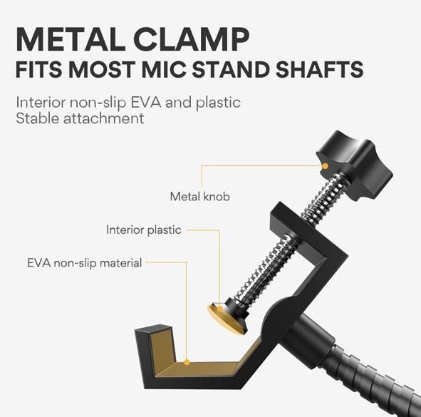 - Säädettävä kiinnike, yhteensopiva useimpien mikrofonitelineiden ja puomien kanssa.