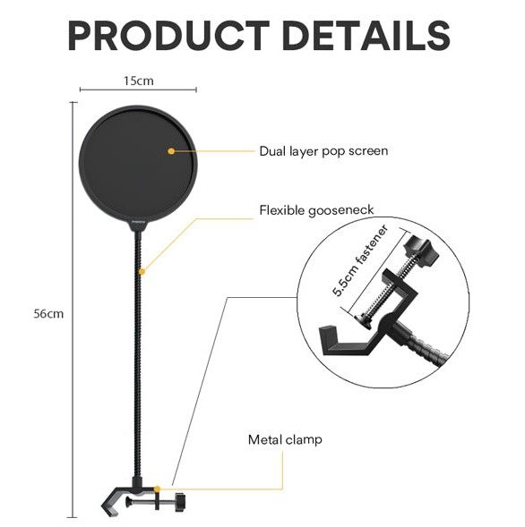 Kaksoiskerroksinen nylon‑verkko pysäyttää ilmapurskahdukset ennen kuin ne osuvat mikrofoniin, jolloin saat tasaisemman, miellyttävän ja ammattimaisemman soundin striimeihin, podcasteihin, voice overeihin ja laulun äänitykseen. Pyöreä suodatin suojaa kapselia myös syljeltä ja pölyltä, pidentäen mikrofonisi käyttöikää ja vähentäen huollon tarvetta.